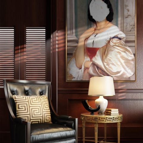 Auguste Renoir Syende dame veggbilde, reproduksjon etter maleri. Bildet viser en sittende dame som syr, med en blomsteroppsats i bakgrunnen. Nederst på rammen er det en metallplate med tittel og kunstnernavn, samt opplysning om at det er en reproduksjon. Bildet er innrammet i en profilert, gullfarget ramme med lys innerkant. Egnet som veggdekor i stue, gang eller andre oppholdsrom.