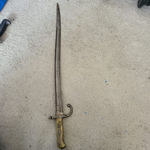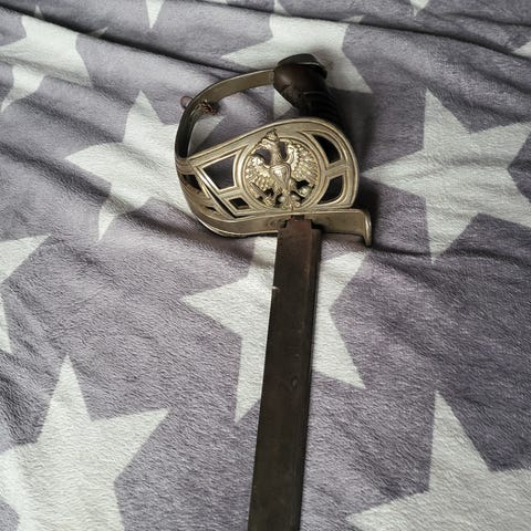 Spansk dekorativ kårde i stål med mørkt, strukturert håndtak og utsmykket parerstang. Bladet er merket «Made in Spain». Kården fremstår som en dårlig kopi. Bud ønskes.