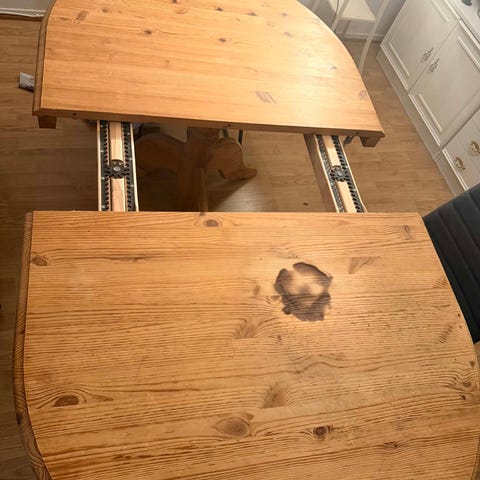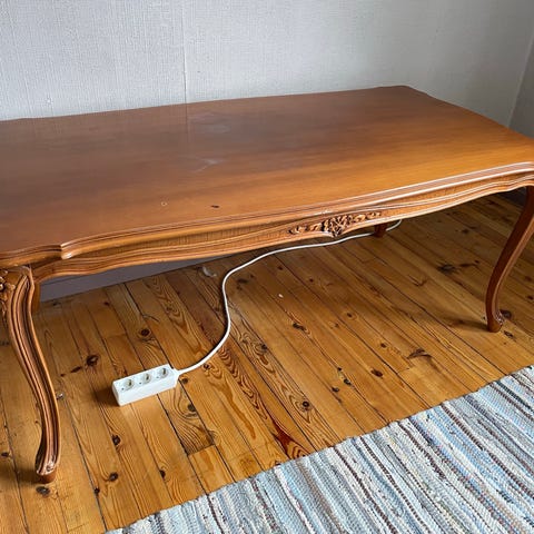 Vi ønsker å gi bort et spisebord til noen som trenger det. Bordet har blank overflate, og enkle utskjæringer. Det ble først brukt som utstillingsbord til klær i en klesbutikk, men har de siste årene fungert utmerket som spisestuebord. Bordet har noen bruksmerker, men er helt og i god bruksstand. Lett å holde rent med blank overflate. Gis bort da vi har kjøpt ny spisegruppe.