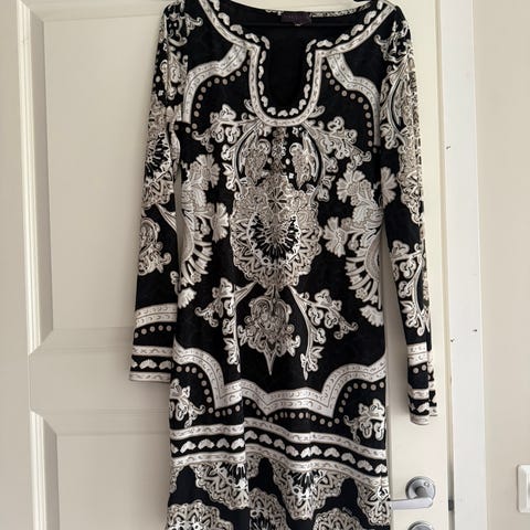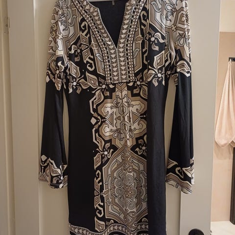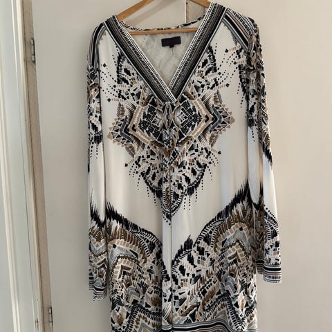 Hale Bob kjole for dame i størrelse XL. Kjolen er flerfarget mønster på svart bunn med blomster- og grafiske detaljer. Modellen har lange ermer og V-utringning med dekor langs kanten. Stoffet er lett og mykt, egnet til bruk ved festlige anledninger eller andre situasjoner der man ønsker en mønstret kjole med hel lengde over kneet, avhengig av høyde. Både for- og bakside har samme type mønster, og kjolen trekkes rett over hodet uten glidelås. Den krøller ikke.