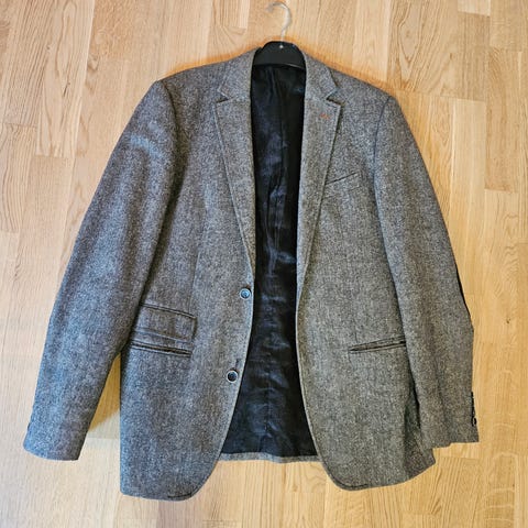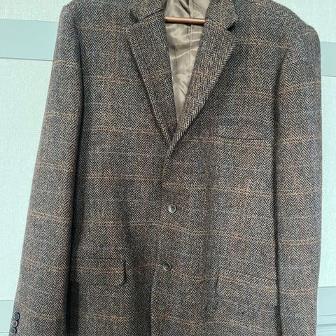 Schlasberg Harris Tweed jakke i grå ull for herre i størrelse S. Jakken er laget av håndvevd Harris Tweed i et klassisk fiskebensmønster. Den har slag, brystlomme, frontlommer og innerlommer.