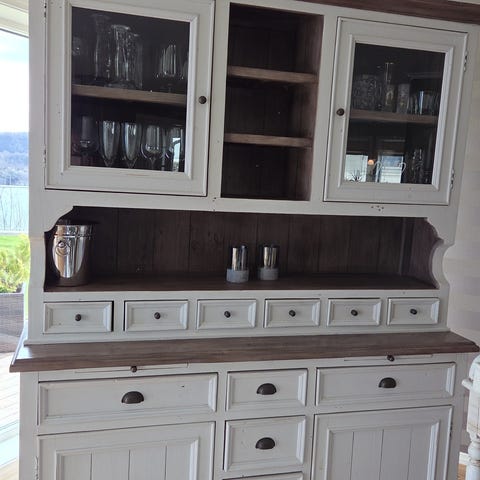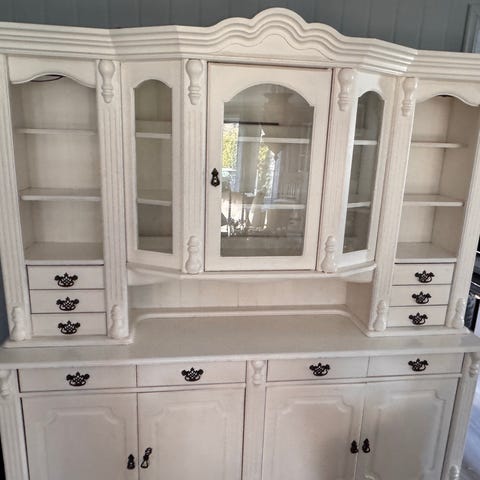 kjøpmannsdisk med vitrinedel i hvit utførelse med treplate på benken. Øvre del har skap med glassdører og åpne hyller for oppbevaring og visning av servise eller andre gjenstander. Nedre del har skuffer og skap med slette fronter og håndtak i metall for lukket oppbevaring. Designet er klassisk med profilerte kanter og passer til bruk på kjøkken, spisestue eller stue som oppbevarings- og arbeidsbenk . Usikker på merke.