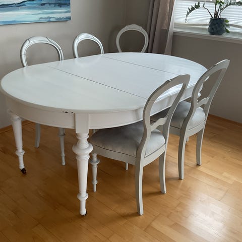 Kjøkken spise gruppe til salgs 4 stoler og et rundt spise bord med med søyle,noen små merker på,stolene kan lett fikses på. Mål på bordet 110 cm i diameter, høyde 73 cm stolene høyde til sete 44 cm, totalt høyde 87 cm, sete på stolene dybde og bredde 42,5 cm.