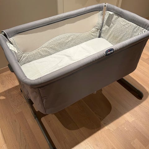 Praktisk og fleksibel Next2me bedside crib fra Chicco som kan plasseres inntil voksenseng med justerbar høyde. Langside kan felles ned for å gi tilgang til babyen. Next2Me lar babyen sove trygt i egen seng, med deg ved siden av. Madrass følger med. Høyden på begge ender kan justeres uavhengig av hverandre slik at hodeenden kan være hevet om ønsket. Kan også brukes som frittstående vugge og reiseseng.