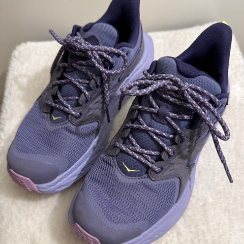 Hoka Anacapa tursko i størrelse 38. Modellen er en ankelhøy tursko egnet for fotturer. Skoene har overdel i tekstil og syntetisk materiale, og yttersåle med Vibram-merket gummi for grep på variert underlag. Fargen er hovedsakelig lilla med mørkere detaljer og lyse lisser. Passer til bruk på tur og fotturer på sti og lett terreng.