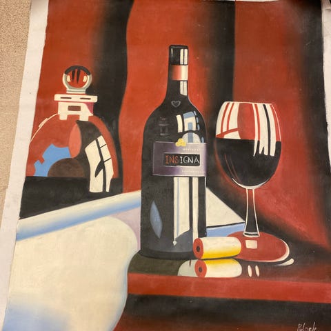 Stilleben bilde med motiv av frukt og bær på bord, innrammet i en flott mørk eike ramme med glass. Bildet viser blant annet druer, melon, sitrusfrukter og servise arrangert på et bord. Passer som veggdekor i stue, kjøkken eller spisestue. Ukjent kunstner og produksjonsår.
