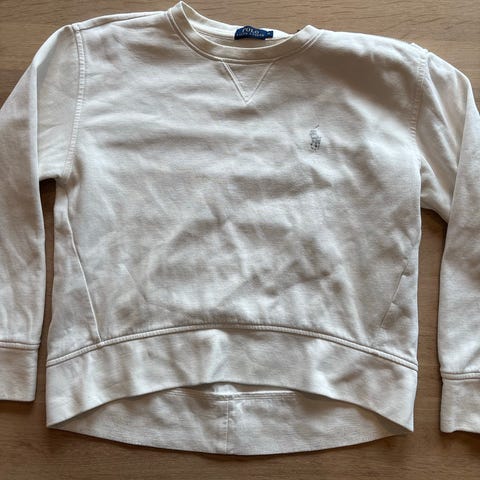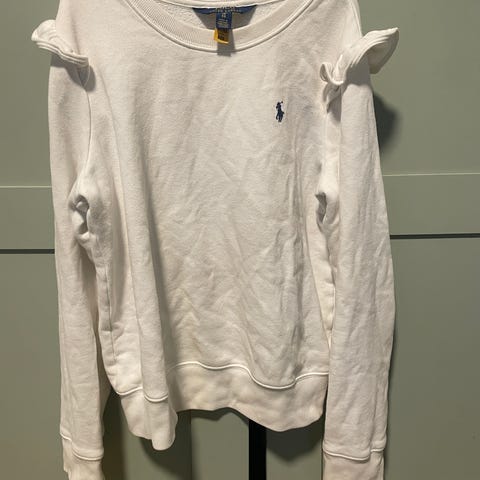 Ralph Lauren Polo genser for dame i størrelse S. Genseren er hvit og laget av bomull. Klassisk modell med rund hals og ribbekanter nederst og på ermene. Diskré logo på brystet. Passer til hverdagsbruk og kan kombineres med både jeans og chinos.