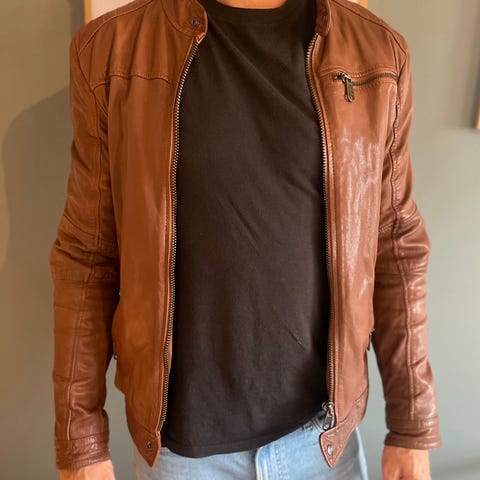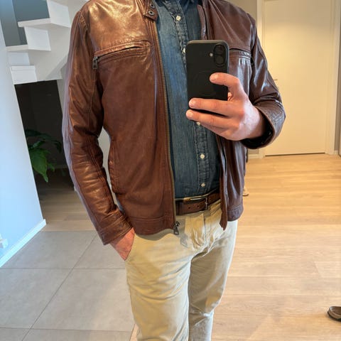 Zara jakke for herre i størrelse M. Jakken er brun og laget i fuskeskinn. Den har glidelås foran, ståkrage med trykknapp og glidelås nederst på ermene. Lommer foran med knappelukking og innerlomme. Egnet som ytterjakke i overgangssesonger, til pent eller en casual stil.