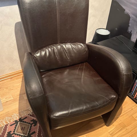 Pent brukt retro lenestol i mørkebrun skinn. Ukjent designer/produsent. Nypris ca 6-7000. Må hentes