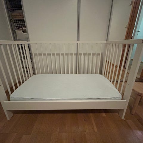 Selger pent brukt sprinkelseng fra norske Trekløver. Klassisk hvit barneseng i god kvalitet. Før pris 2699, selges for 700,- Madrass er pent brukt og medfølger hvis ønskelig. Enkelte bruksmerker som vist på bildet.