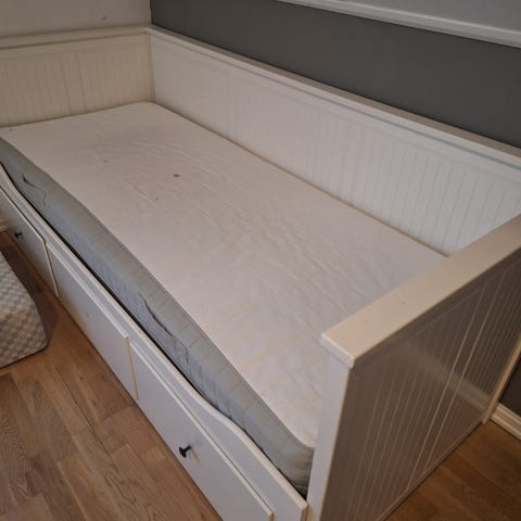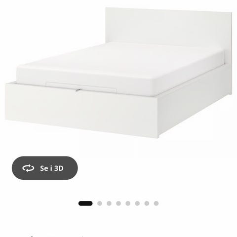 IKEA MALM seng i størrelse 160x200 cm. Sengen er i fargen hvitbeiset eikefiner. Høyde på hodegavl er 100 cm, og total lengde er 209 cm. Madrassmål er 160 cm i bredde og 200 cm i lengde. Fri høyde under sengen er 21 cm, som gir plass til oppbevaring under rammen. Passer til standard madrass på 160x200 cm.