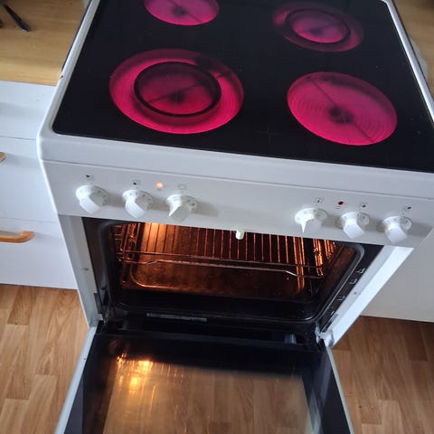Stekeovnen er uten feil og mangler., og den steker jevnt å fint og har varmluft og grill funksjon. Kjeler og stekepanne kan følge med om ønskelig. Følger med en rist og en langpanne uten høy kant.