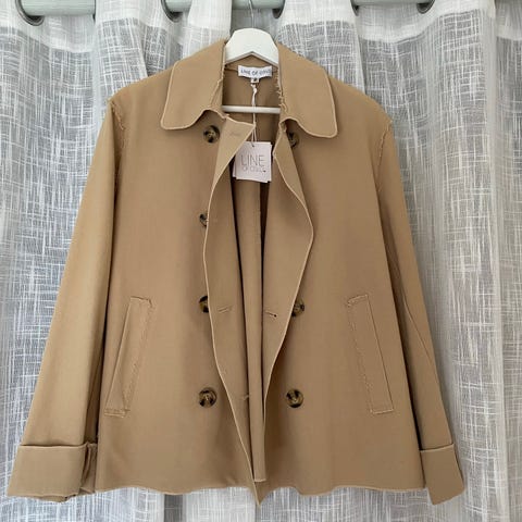 Line of Oslo jakke for dame i størrelse S. Jakken er laget i bomull og har et flerfarget kamuflasjemønster. Den har flere frontlommer med klaff, merkelapp med «HOPE» foran og stor tekst «MAKE LOVE NOT WAR!» på ryggen. Passer som en lett, uforet jakke til hverdagsbruk.