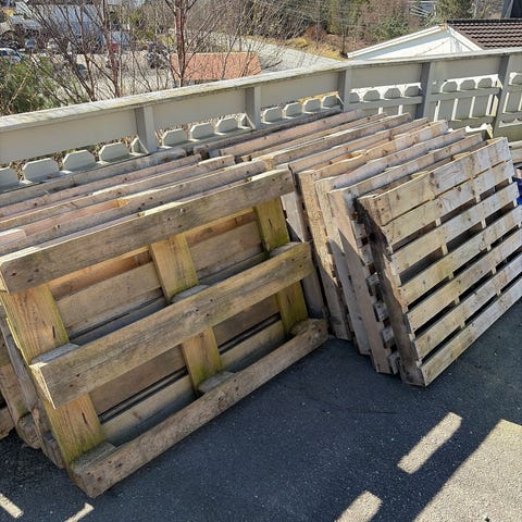 Har mange pallernog div treverk som skal kastes. Men mye god ved dersom man har tid til å kutte opp