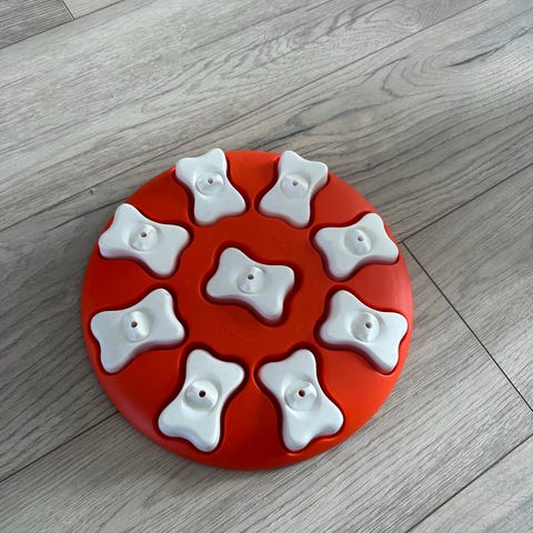 Lunoji Pebble aktivitetsleke for hund i blå farge. Produktet er utformet som en rund leke der hunden kan få tørrfôr eller godbiter gjennom lek og aktivitet. Leken kan brukes til mental stimulering og for å gjøre måltider mer utfordrende for hunden. Egnet til innendørs bruk og kan fylles med ulike typer tørrfôr eller små godbiter etter behov.