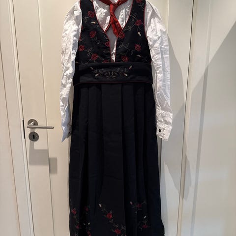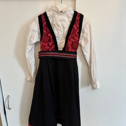 Cubus bunadskjole for jente i størrelse 134-140. Kjolen er flerfarget med mørk hovedfarge og kontrastfelt, og er laget i bomull. Modellen har liv med mønster, hvit skjorte under og langt skjørt. Passer til bruk ved høytider, konfirmasjon, 17. mai og andre anledninger der man ønsker et tradisjonspreget antrekk for barn. Veldig bra tilstand