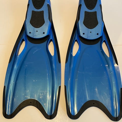 Korte svømmeføtter i blå og svart farge. Svømmeføttene har lukket hæl og fleksibel gummisåle med mønster for bedre grep. Overdelen er i plast med ventilasjonshull over foten. Egner seg til bading, snorkling og lett svømming i basseng eller sjø. Str. 42-43