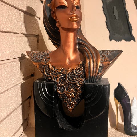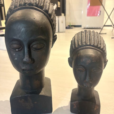 Bystepar black americana dekorfigurer i keramikk. Figurene forestiller to byster med store øreringer i metall. Overflaten er matt og malt i svart med beige detaljer. Noen mindre avskallinger i malingen er synlige på skuldre, rygg og kanter. Egner seg som dekorative pyntegjenstander til hylle, skjenk eller vinduskarm. Høyde: 14 cm