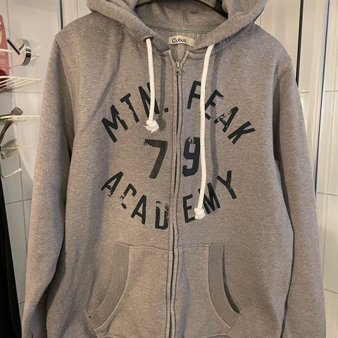 Russedress hettegenser for dame i størrelse S. Genseren er grå og har glidelås i front, kengurulommer og hette med snøring. Trykk med anker og «Kongshavn» på ryggen samt lite brysttrykk foran. Materiale ifølge vaskelapp er 80 % bomull og 20 % polyester. Passer til hverdagsbruk eller som skole- og russeplagg.