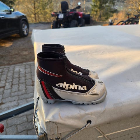 Alpina skisko str 29. Brukt noen få ganger under skisesongen i fjor av ett barn. Skoene har glidelås foran med beskyttende overtrekk og er tilpasset moderne langrennsbindinger. Overdelen er laget i syntetisk materiale med tekstilfôr på innsiden for økt komfort og varme.