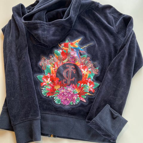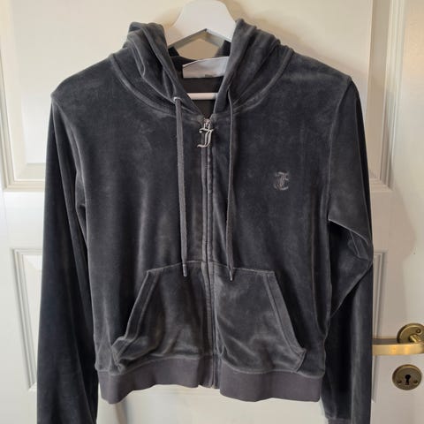 Juicy Couture hettegenser for dame i størrelse M. Genseren er grå og laget i polyester med myk velurlignende overflate. Modellen har glidelås i front, hette med snøring og kengurulomme. Brodert J-logo foran og J-detalj på glidelåsen. Passer til hverdagsbruk og som en del av et avslappet sett.