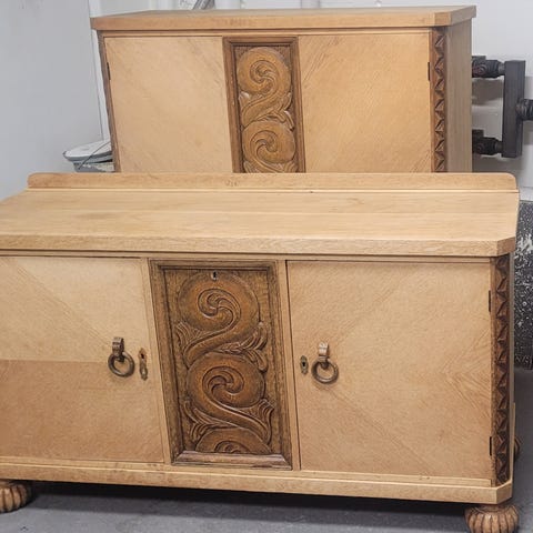 Spisestuestol og skjenk i utskåret eik med mørke detaljer. Møblene er produsert til dr Frans Aubert i september 1904 av Joh. Johannesen på Ski. Møblene har dekorativ treskjæring og mørke smijernsbeslag. 10 stoler har sete med mørk plate festet med synlige nagler. Det må skiftes sete på 8 stoler sidan trekka er sprukne. Skjenken har overskap med dører, åpen hylle i midten, uttrekkbar skriveplate, skuffe og underskap med dør og skuff. Det er ikkje nøkler til skuffer og skap. Passer til bruk i spisestue eller stue der det er ønskelig med møbler i heltre med utskårne detaljer. Set ein pris, men ynskjer tilbod.