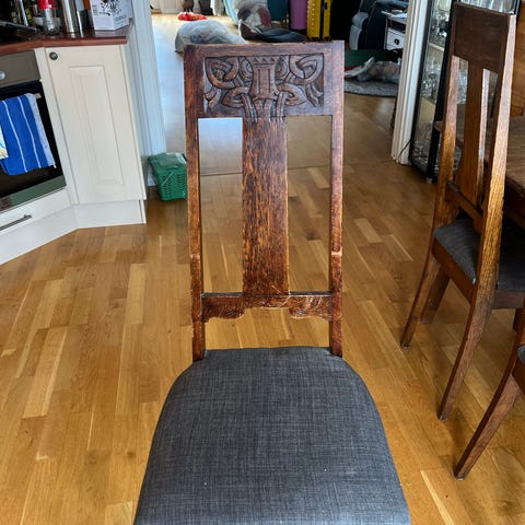 Spisestuestol og skjenk i utskåret eik med mørke detaljer