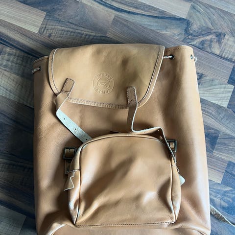 Beckmann ryggsekk i lyst lær. 45cm høg 35 cm brei. Stor lomme midt på. Et stort rom. Polstretnede på ryggpartiet. Stillbare ryggremmer.