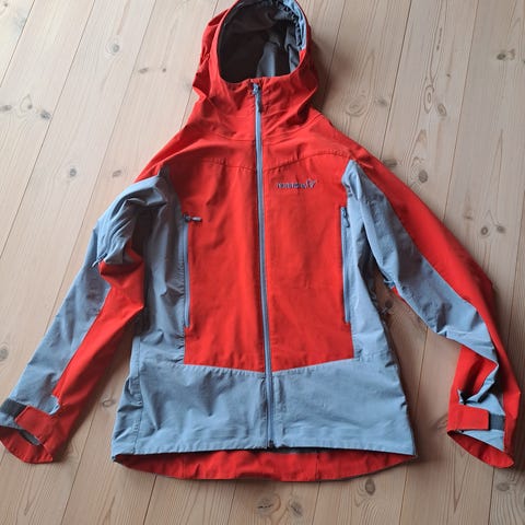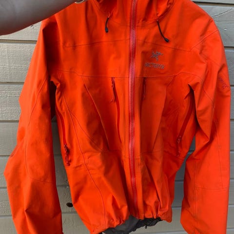 Arc’teryx jakke for herre i størrelse M. Jakken har hette og hel glidelås foran. Innsiden har grått fôr/laminat, og utsiden er i røde nyanser. Modellen har flere glidelåslommer i front og justering nederst og ved hetten. Egnet som ytterjakke til ulike utendørsaktiviteter.