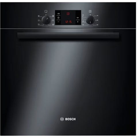 Bosch HBG872 stekeovn med varmluft i svart utførelse. Innbyggingsovn beregnet for montering i høyskap eller under benk. Front med stor glassdør og integrert håndtak. Elektronisk betjening med display og berøringsknapper på oversiden av døren.