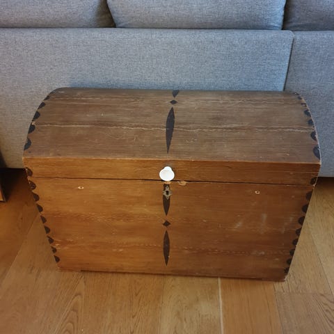 Kista er veldig flott med pent treverk og fine detaljer med beslag og hjørner.