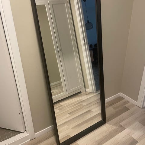 IKEA helkroppsspeil med rektangulær form og svart, smal ramme. Speilet er frittstående (men har feste til å henge på vegg også) og egner seg godt på soverom, gang eller garderobe for helkroppsvisning. Rammen er i et enkelt og moderne design som passer inn i de fleste interiørstiler.