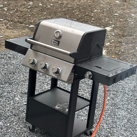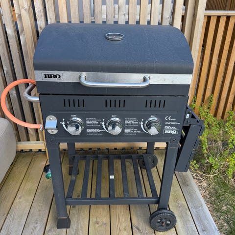 BBQ gassgrill med tre hovedbrennere i svart utførelse. Grillen har lokk med innebygd termometer og frontpanel med tre separate reguleringsknapper for justering av varme. Innvendig er det grillrister i metall og varmefordelere over hver brenner. Under grilldelen er det plass til gassflaske på hylle, og grillen har hjul på understellet for enklere forflytning. Gasslange og regulator er koblet til i front. Passer til grilling av kjøtt, fisk og grønnsaker på terrasse eller i hage der gassgrill er ønsket. Grillen har blitt brukt 3 ganger og selges på grunn av flytting.