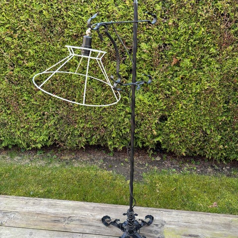 Håndlaget smijern lampe. Laget for minimum 50 år siden. Malt og fixet opp med ny skjerm for ca. 10 år siden. Lampen fungerer og lyser.