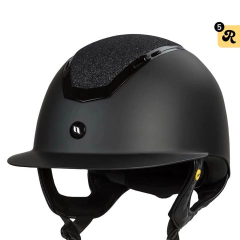 Hansbo sport ridehjelm glossy black med glitterfelt på toppen. Med mips system, str S 52-54 cm. Mips-system klart anbefalt mtp rotasjonsskade.