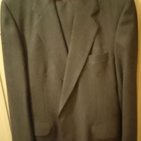 Blå dress for herre i størrelse M. Dressen består av dressjakke med to knapper foran og bukse i matchende stoff og farge. Klassisk snitt som passer til formelle anledninger, jobb eller andre situasjoner der pen bekledning er ønsket. Jakken har splitt bak. Det er to merker inni jakken. Det ene viser "Styled by Hovding, Norway" og det andre "Troelstrup, København". Dressen er relativt gammel og litt tung, men solid. Materialet virker å være en slags ullblanding.