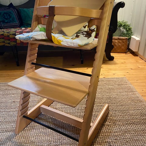 Stokke Tripp Trapp barnestol i tre med naturfarget finish. Stolen har justerbart sete og fotbrett som kan tilpasses barnets høyde. Klassisk design med sidevanger i tre og tverrstag i metall. Egnet som spise- og sitteplass ved bord for barn, og kan tilpasses etter hvert som barnet vokser.