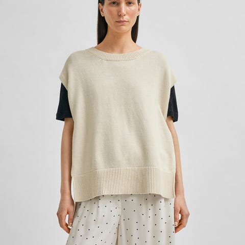 Dog vesten –Laget av en myk blanding av mohair og ull, har den rund hals, hoftelang front og litt lengre bakside for en moderne, flatterende silhuett.