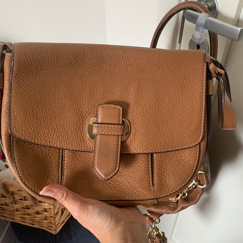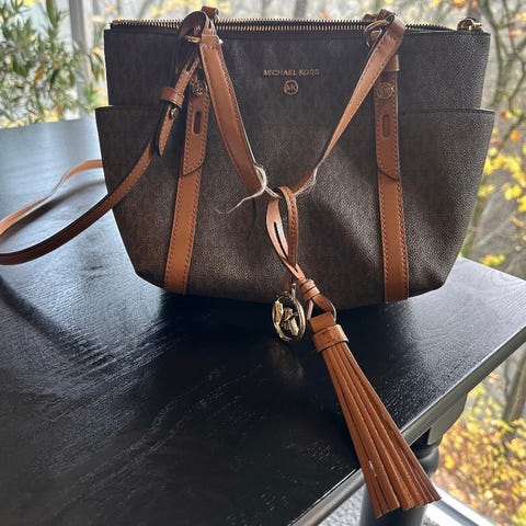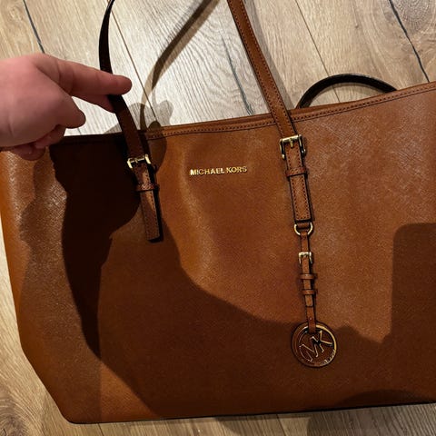 Michael Kors skinnveske i brunfarget lær. Innvendig er den delt i flere rom, blant annet et hovedrom med glidelås og åpne sidelommer for organisering av innhold.