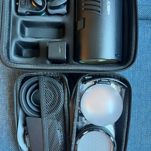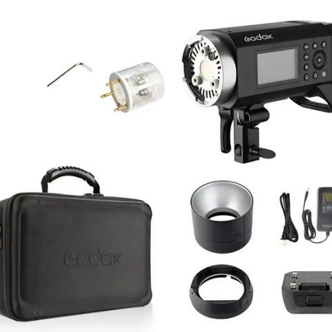 Godox AD200Pro blits for kamera. Kompakt, batteridrevet studioblits med utskiftbare blitshoder. Viser digitalt display med innstillinger på baksiden.