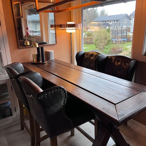 Kjempe fint spisebord som både er langt og bredt! Dette er nok trolig den eneste i sin stil, da denne er pusset ned og beiset. Vært utrolig fornøyd med bordet, men det blir dessverre for massivt i vår lille spisestue☺️ noe slitasje i kantene på boret, som opprinnelig var fuget før vi pusset ned, så vil trolig tro man bare kan fuge kanten på nytt