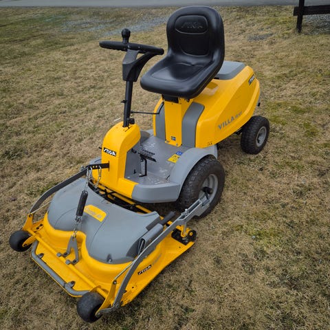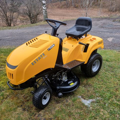 Stiga Estate sitteklipper gressklipper i gul farge. Modellen har førersete, rattstyring og fire hjul. Den er utstyrt med oppsamler bak for gress, og kan også brukes med tilhenger bak, som vist på bildene. Egnet for klipping av plen på større områder der man ønsker å sitte på maskinen under bruk. Ny olje, nytt filter,nye plugger, nytt batteri ,går kjempefint, lite brukt. Med henger ,batteri lader. kostet ny for klipperen 29000