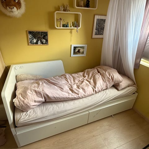 Selger en pent brukt IKEA dagseng med skuffer i hvit utførelse. Sengen har integrerte uttrekksskuffer under liggeflaten som gir ekstra oppbevaringsplass til for eksempel sengetøy, puter eller klær. Sengen er 80*200 cm, men kan drar ut til 160 cm. Passer til bruk som enkeltseng, dagseng eller gjesteseng. Sengen ca 7 år gammel, og selges uten madrass. Nypris er 3000 kr. Legger ved bilder fra nettstedet, i tillegg til våre egne.