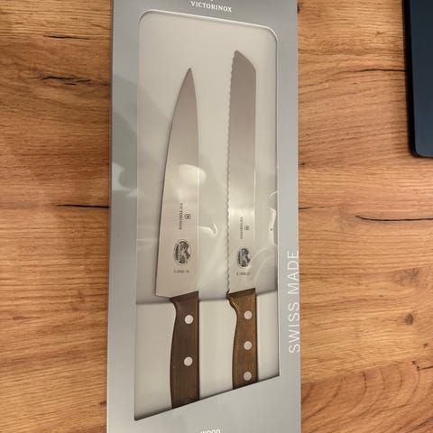 «Kvalitativt knivsett med håndtak i maple wood fra Victorinox. Settet består av en brødkniv 21 cm og en kokkekniv 19 cm.