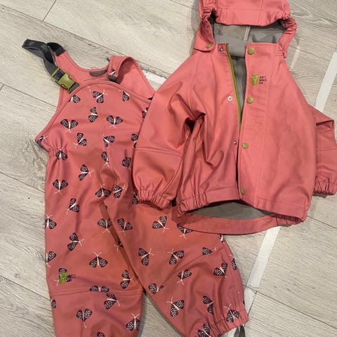 Kattnakken barneklær regnjakke og bukse i flerfarget design. Passer til barn i størrelse 92 cm. Jakken har hette og trykknapper, og buksen har seler. Materialet består av 100 % polyester med fleecefôr, egnet for bruk i vått vær. Unisex modell.