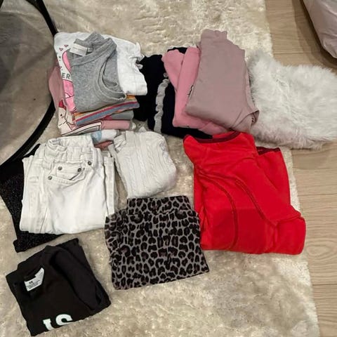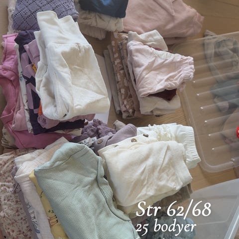 Pakke med babyklær for jente i størrelse 62. Klærne består av ulike plagg som blant annet bodyer, gensere, bukser, shorts og heldresser i myke materialer. Fargene er hovedsakelig i lyse og duse toner som rosa, beige, hvit og mønstrede varianter. Klærne passer til hverdagsbruk for baby i størrelse 62.
