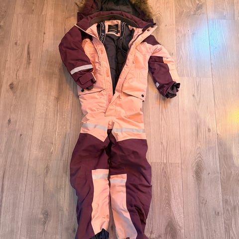 Didriksons parkdress for barn i størrelse 134. Dressen er lilla og laget i polyester. Modellen har hel glidelås foran, justerbare ermeåpninger og fotstropper. Forsterkede partier på knær og sete samt refleksdetaljer for bedre synlighet. Ytterstoffet er vanntett ifølge merkelapp (100 % waterproof).