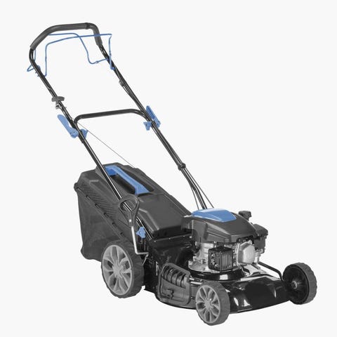 Biltema bensindrevet gressklipper i blå farge. Gressklipperen har forbrenningsmotor og er egnet for klipping av plen i hage. Den har store bakhjul for enklere manøvrering og håndtak med plastgrep. Klipperen har oppsamler bak for gressavfall. Passer til privat bruk på små til mellomstore plener.