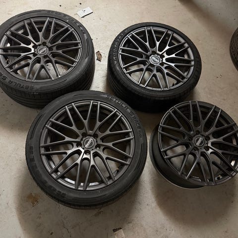 Selger noen protrack hjul som bare ligger og støver. Står på dekk som har gått ca 5k km. Ikke noe kast i hjul, men dessverre er 2 litt kantkjørt.