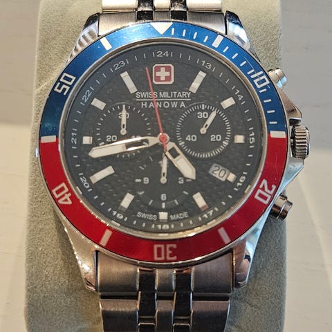 Selger en tøff og maskulin Swiss Military Hawk Chronograph klokke. Dette er en solid og sporty herreklokke med sveitsisk presisjon og et robust design som passer perfekt til både hverdagsbruk og fritid.